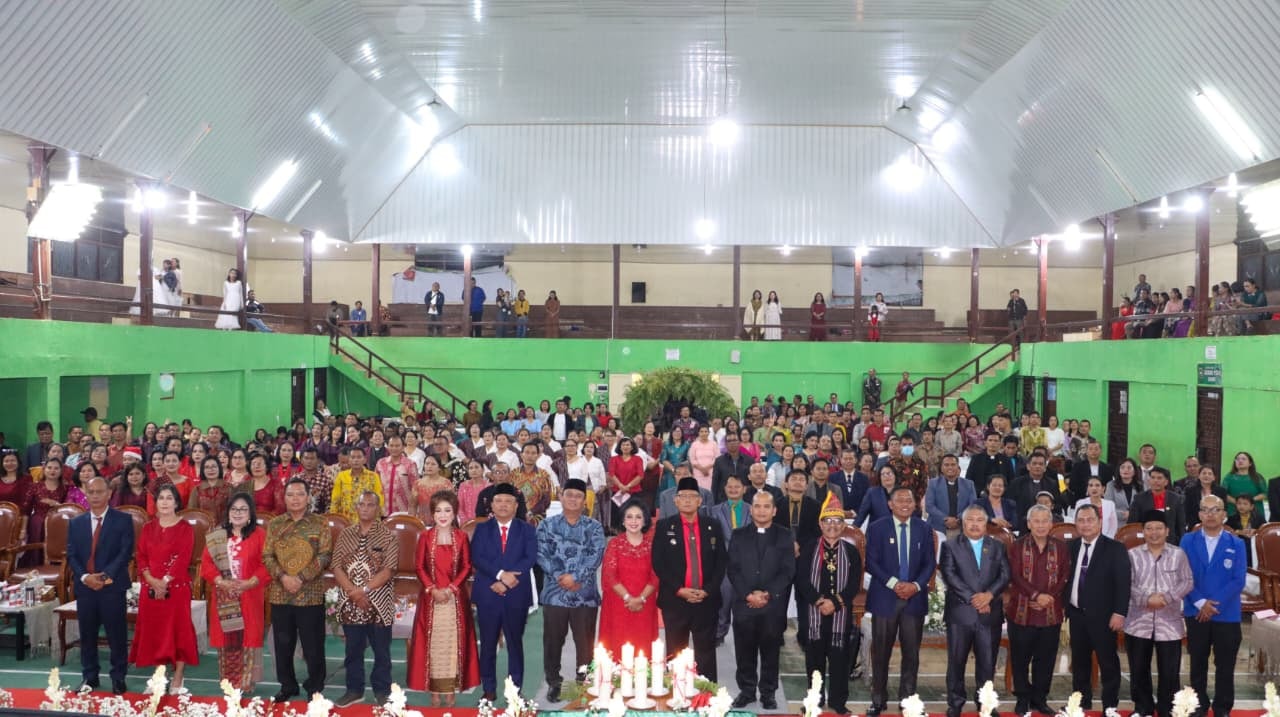 dailhyutama.id, DAIRI – Dengan tema Allah hadir untuk menyelamatkan keluarga (Matius 1:21-24), Pemkab Dairi rayakan Natal Oikumene pada Kamis (18/12/2025) di GOR Sidikalang. Natal Oikumene dihadiri oleh Bupati Dairi Vickner Sinaga, Wakil Bupati Dairi Wahyu Daniel Sagala, Ketua TP PKK Dairi Rita Puspita Vickner Sinaga, serta Unsur Forkopimda Dairi.